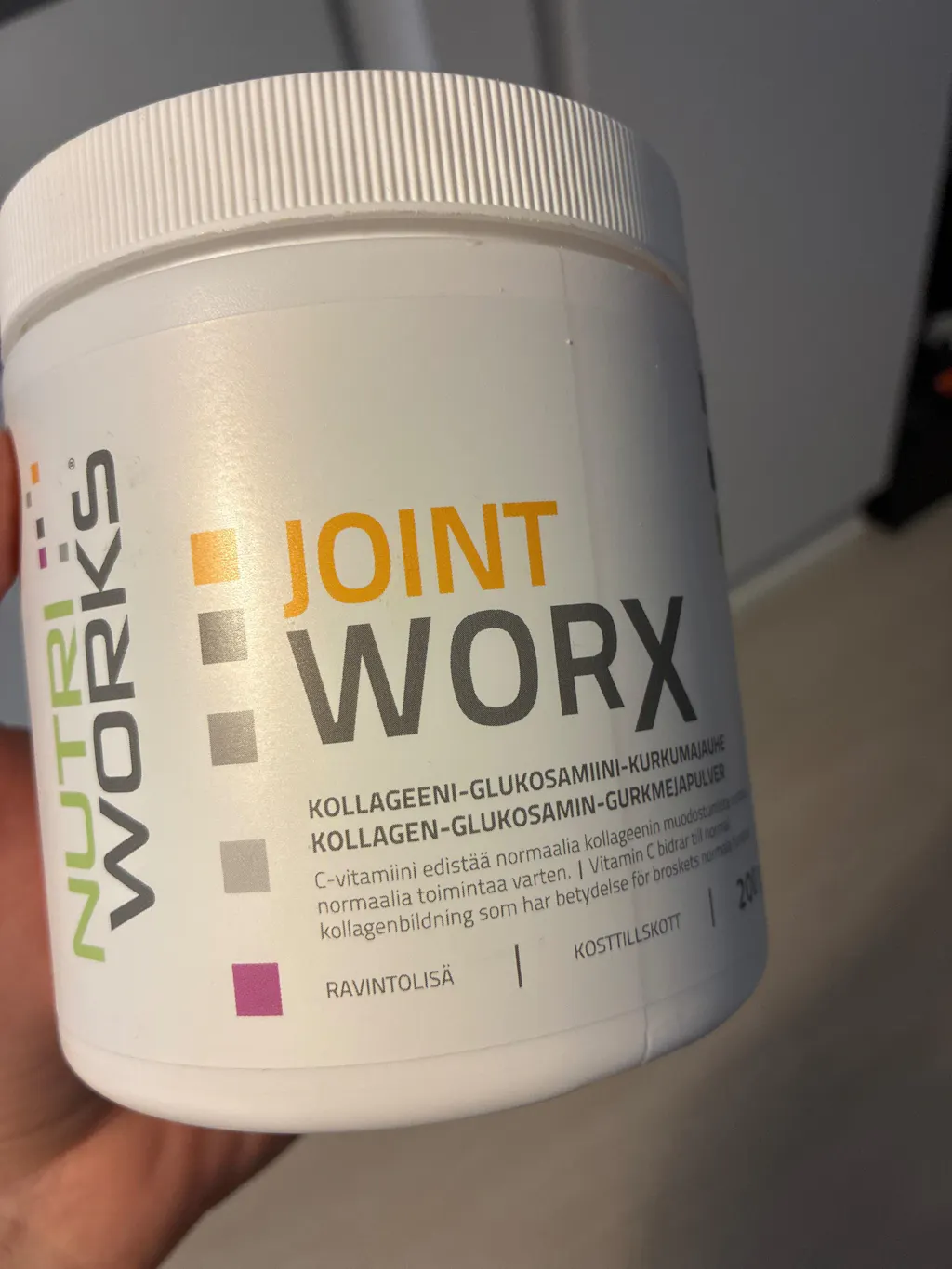 Ainesosat: kollageeni (naudasta), glukosamiinisulfaatti (ÄYRIÄISISTÄ), kondroitiinisulfaatti (kanasta), kurkuma, happo (omenahappo), L-askorbiinihappo, luontainen sitruuna-aromi, mustapippuriuute, mangaaniglukonaatti, kupariglukonaatti, kaliummolybdaatti