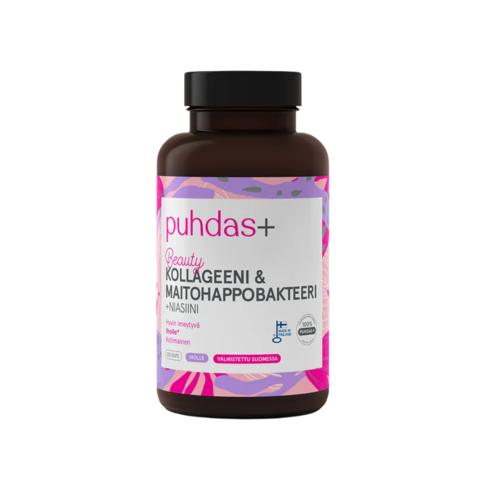 Hydrolysoitu Peptan®-nautakollageeni, kapseli (stabilointiaineet: hydroksipropyylimetyyliselluloosa, gellaanikumi), täyteaine (mikrokiteinen selluloosa), inaktivoitu maitohappobakteerijauhe (Lactobacillus plantarum), nikotiiniamidi.