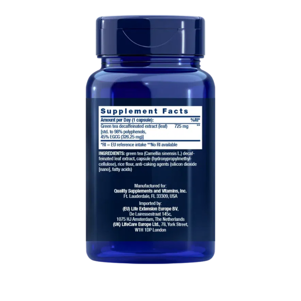 Grönt te (Camellia sinensis L.) koffeinfritt bladextrakt, kapsel (hydroxipropylmetylcellulosa), rismjöl, klumpförebyggande medel (kiseldioxid [nano], fettsyror)