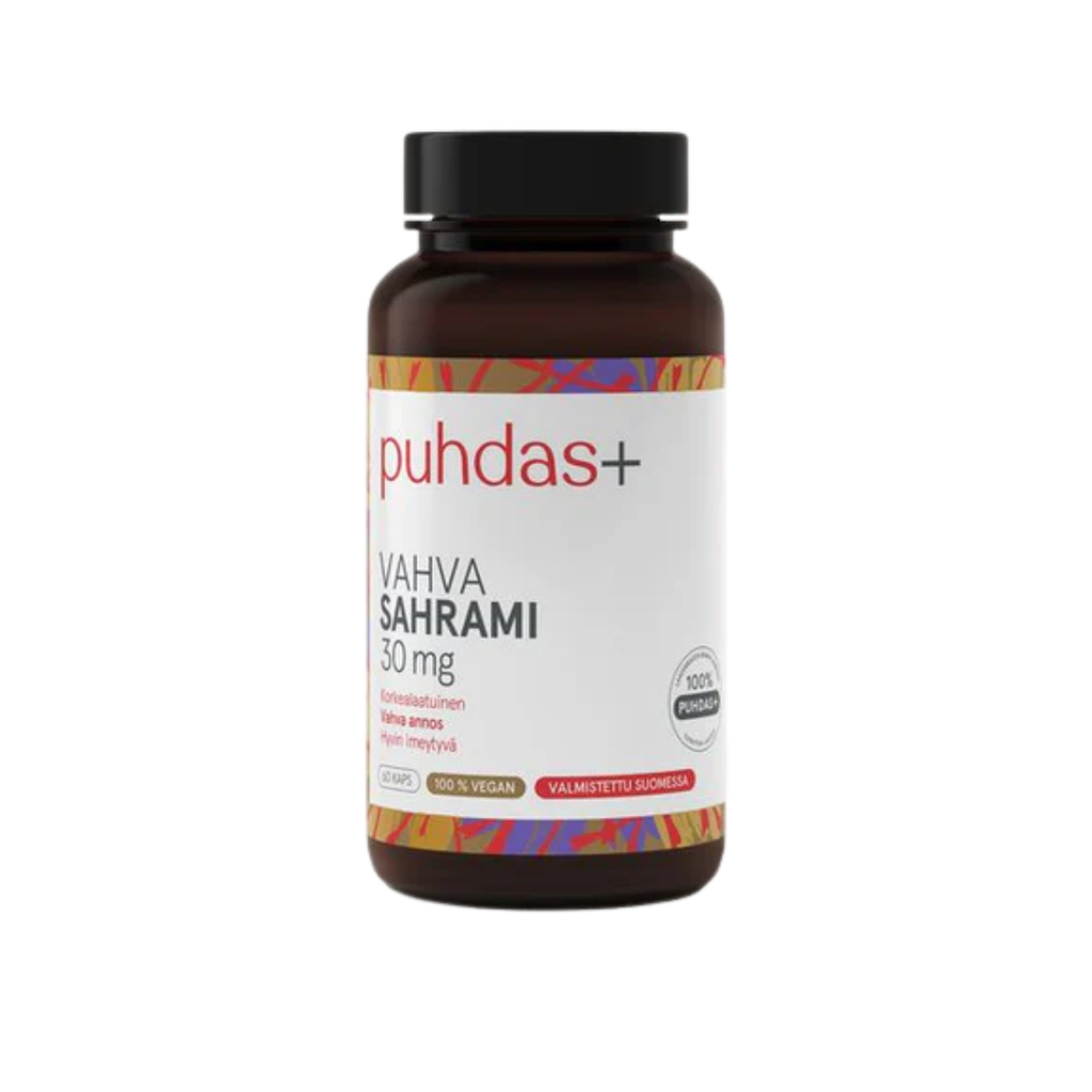Ravintosisältö / Näringsinnehåll 1 - 2 kaps Sahramiuute / saffransextrakt 30 - 60 mg -josta safranaalia / varav safranal 600 – 1200 µg -ja krosiinia / och crocin 900 – 1800 µg
