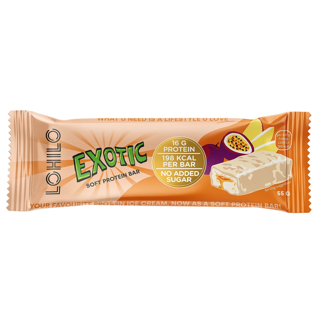 Pehmeä proteiinipatukka mangon ja passionhedelmän makuinen, valkosuklaakuorrutteella