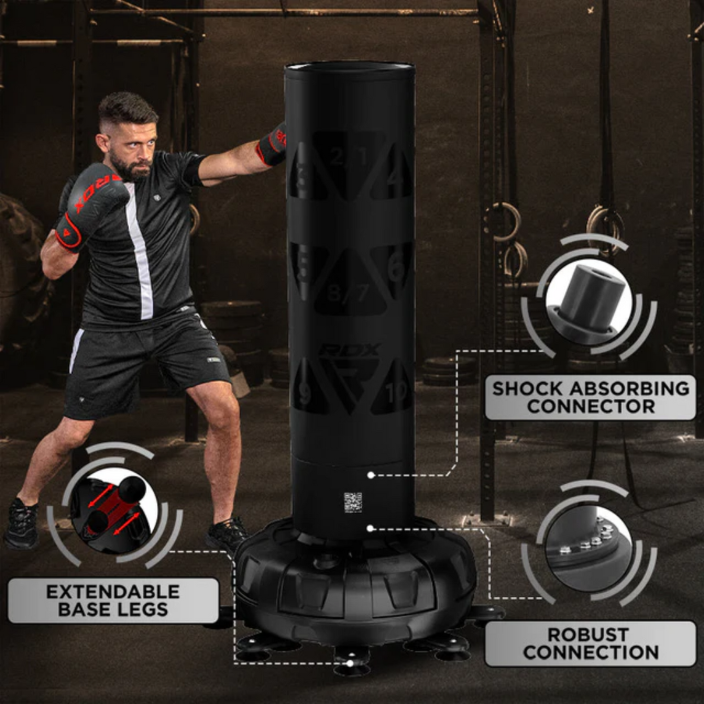 RDX KT Ronin 6ft Free Standing Target Nyrkkeilysäkki With Mitts Set sisältää kuvan nyrkkeilysäkkitornin ja laadukkaat RDX nyrkkeilyhanskat.