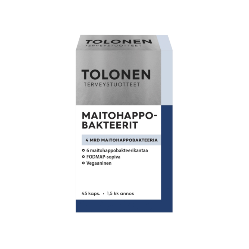 Suositeltu vuorokausiannos (1 kaps.) sisältää: 4 mrd. maitohappobakteeria. 6 maitohappobakteerikantaa.